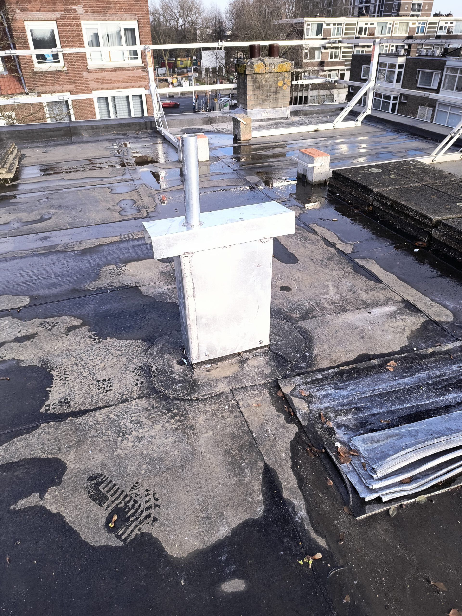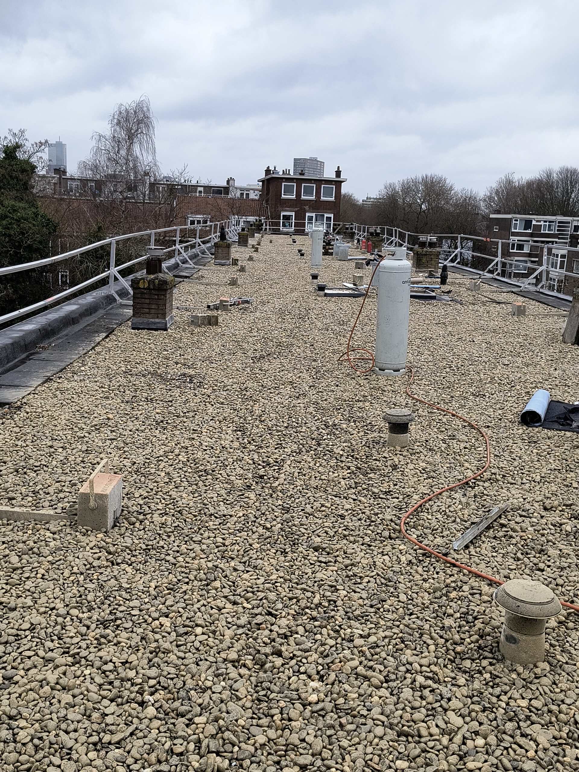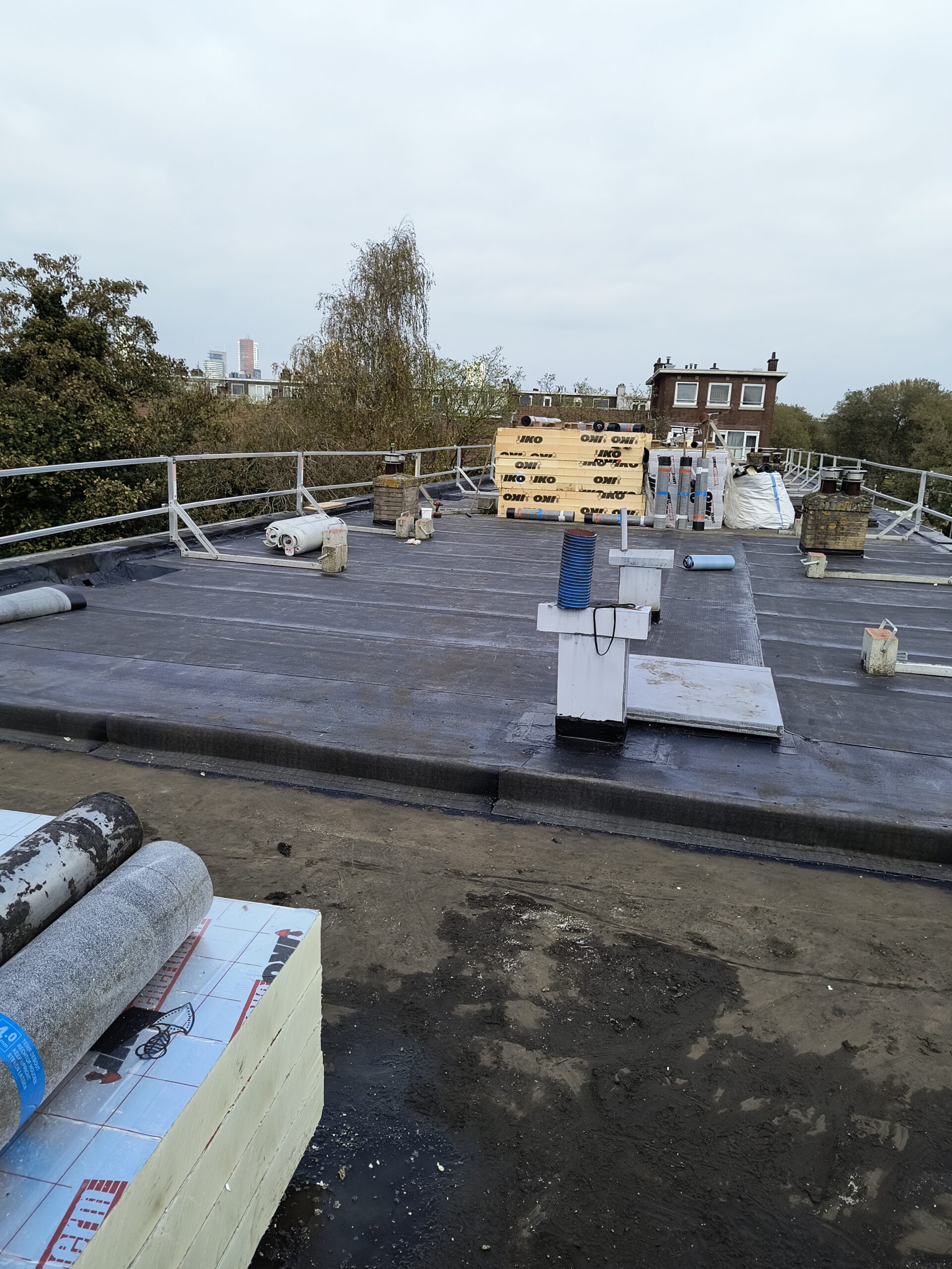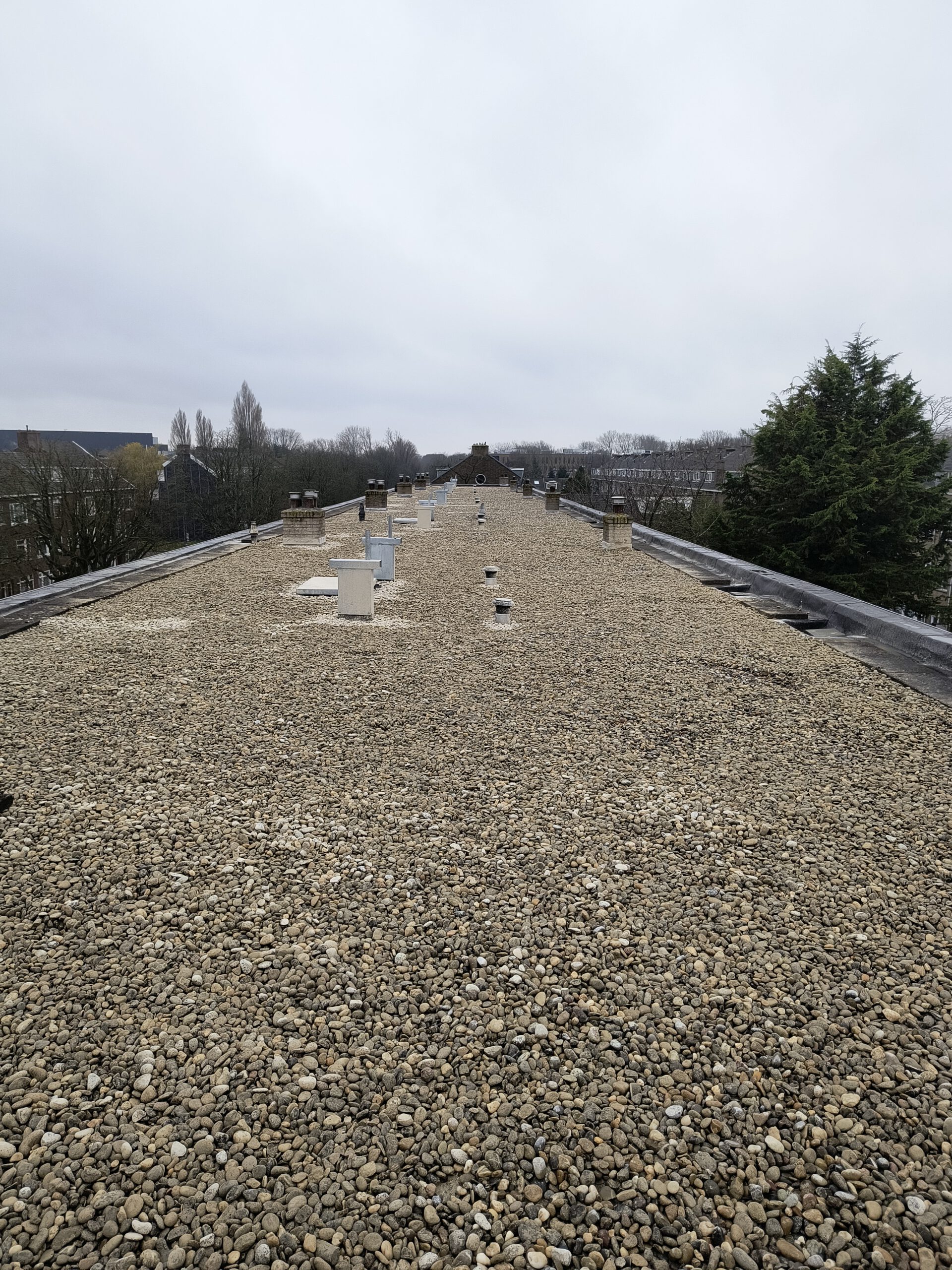 Het dak stond voor groot onderhoudt(MJOP) in de planning 2026. Deze werkzaamheden zijn vervroegd uitgevoerd zodat het binnen het project "steigers op zuid" valt. Het dak bestond uit bitumen gebrand en daarop dakgrind. Voor het uitvoeren van dit werk zijn bij het opstarten 3 grote vrachtauto's gekomen om het grind eraf te zuigen en daarna te laten spoelen en wassen zodat het daarna terug kan gestort worden op het dak. Tevens is er een isolatie laag van 12 cm toegepast wat een hoge Rc waarde geeft. De foto's geven weer het verloop van de werkzaamheden.