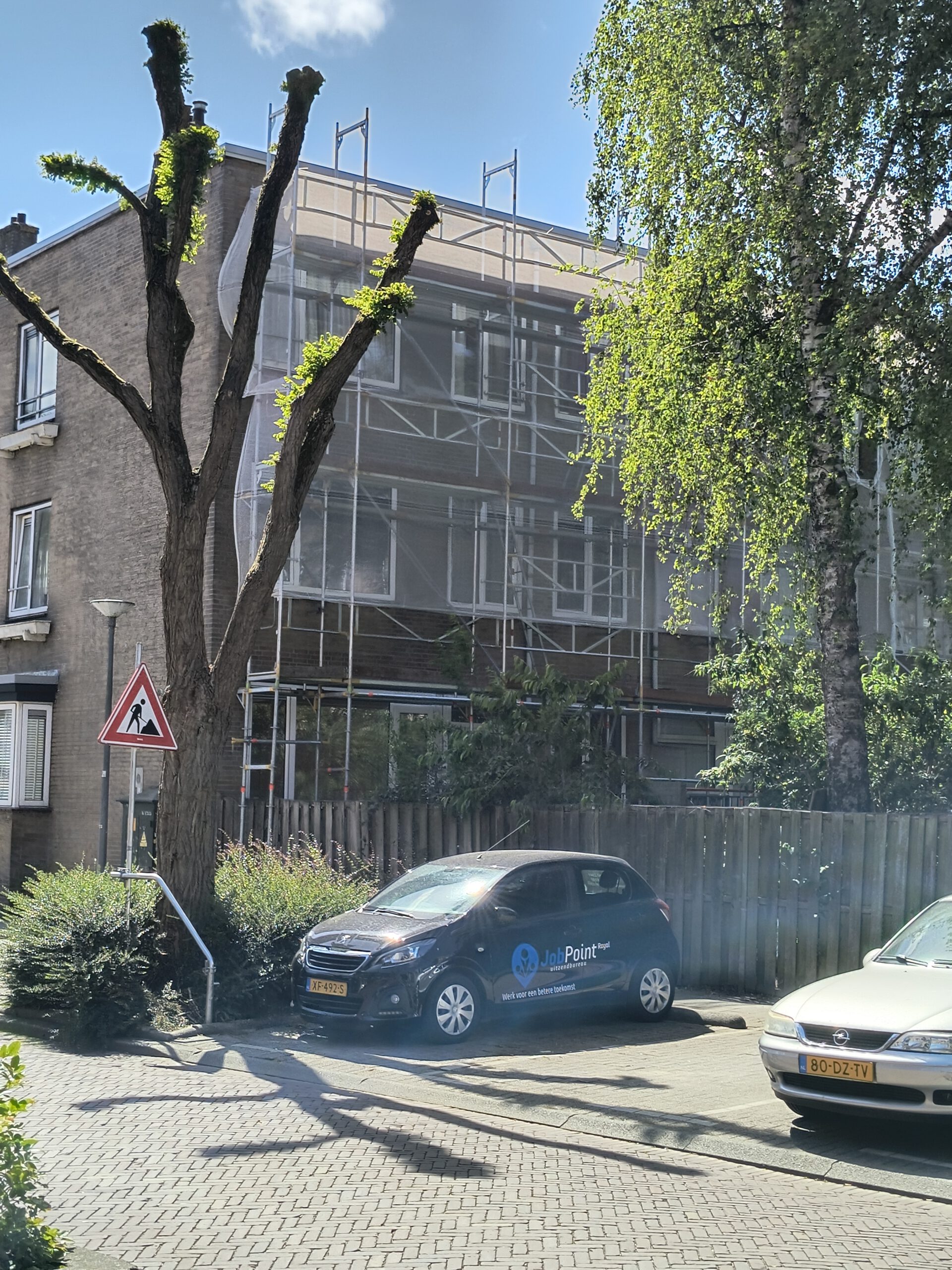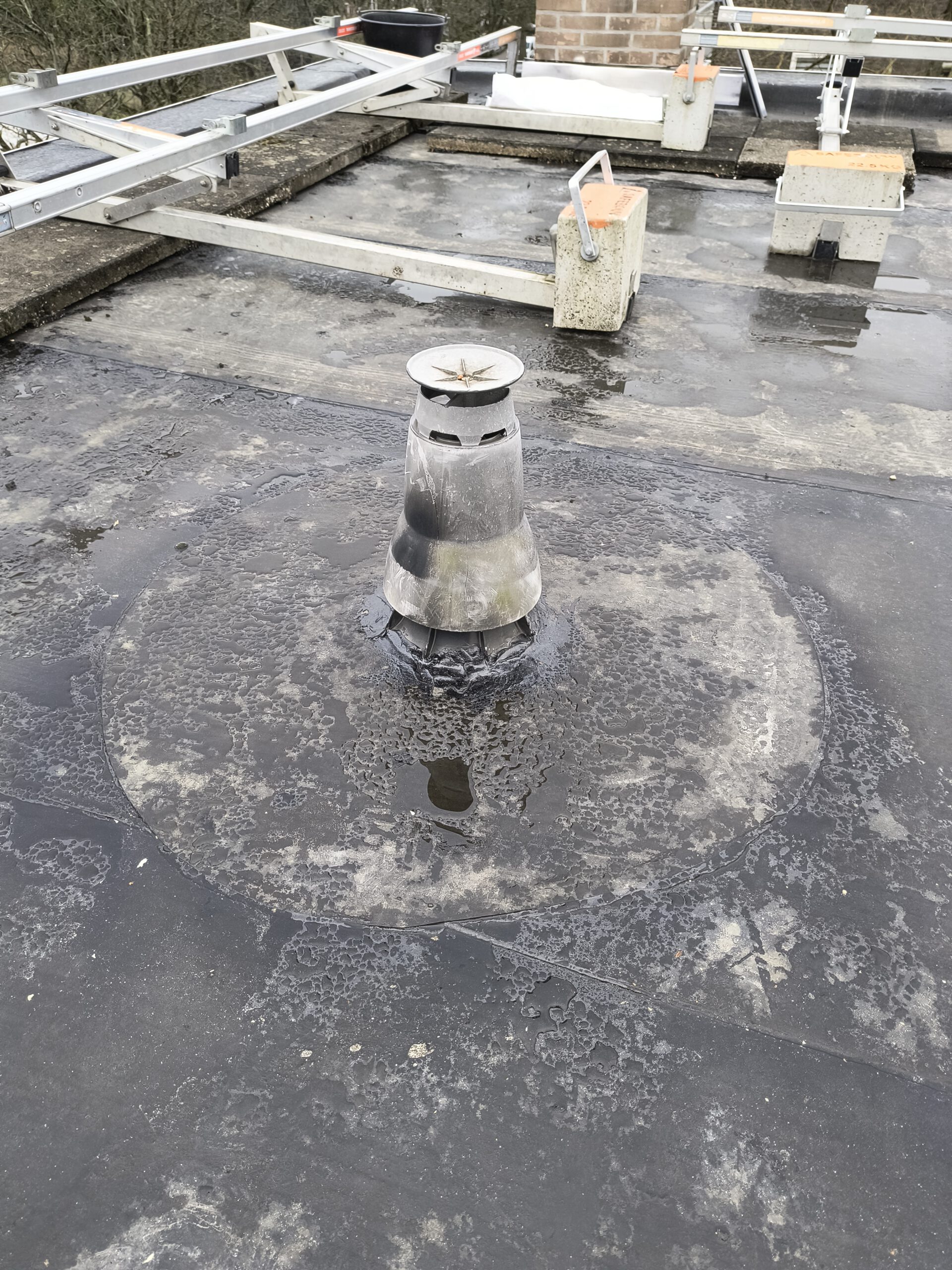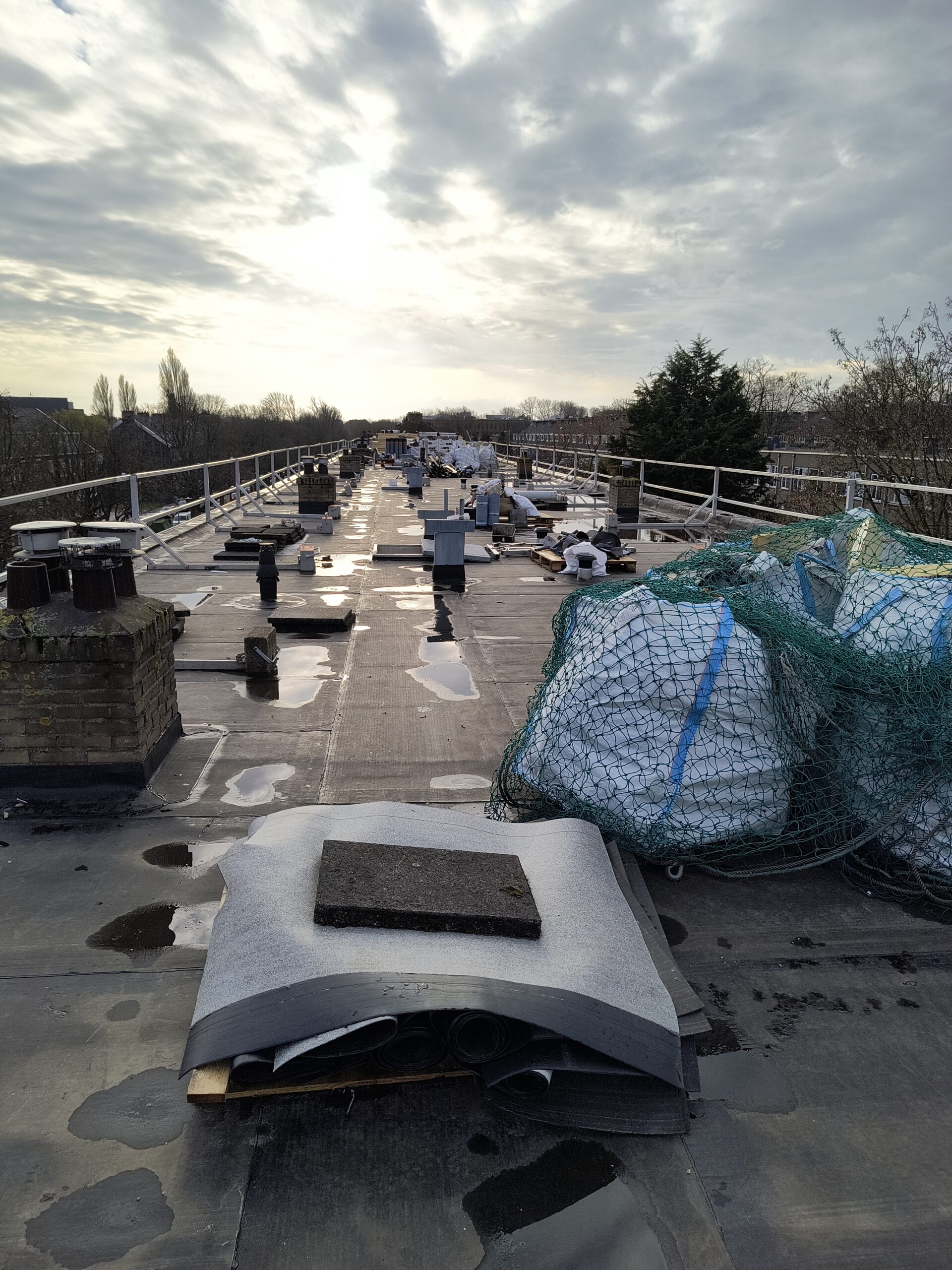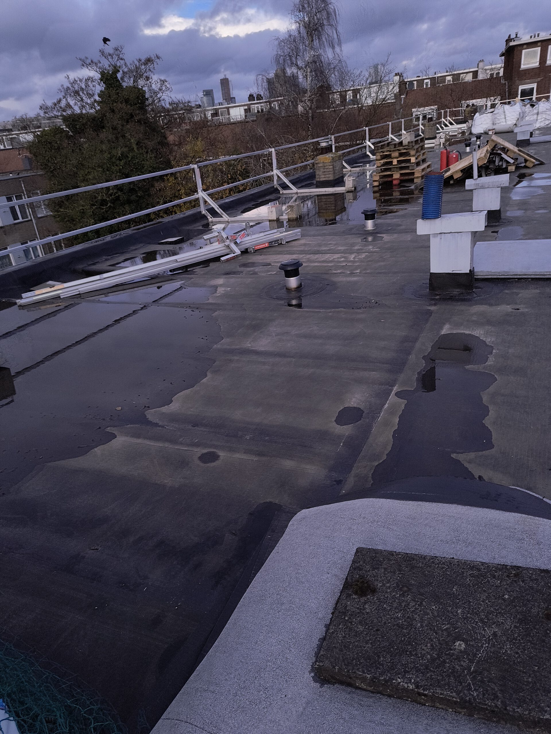 Het dak stond voor groot onderhoudt(MJOP) in de planning 2026. Deze werkzaamheden zijn vervroegd uitgevoerd zodat het binnen het project "steigers op zuid" valt. Het dak bestond uit bitumen gebrand en daarop dakgrind. Voor het uitvoeren van dit werk zijn bij het opstarten 3 grote vrachtauto's gekomen om het grind eraf te zuigen en daarna te laten spoelen en wassen zodat het daarna terug kan gestort worden op het dak. Tevens is er een isolatie laag van 12 cm toegepast wat een hoge Rc waarde geeft. De foto's geven weer het verloop van de werkzaamheden.