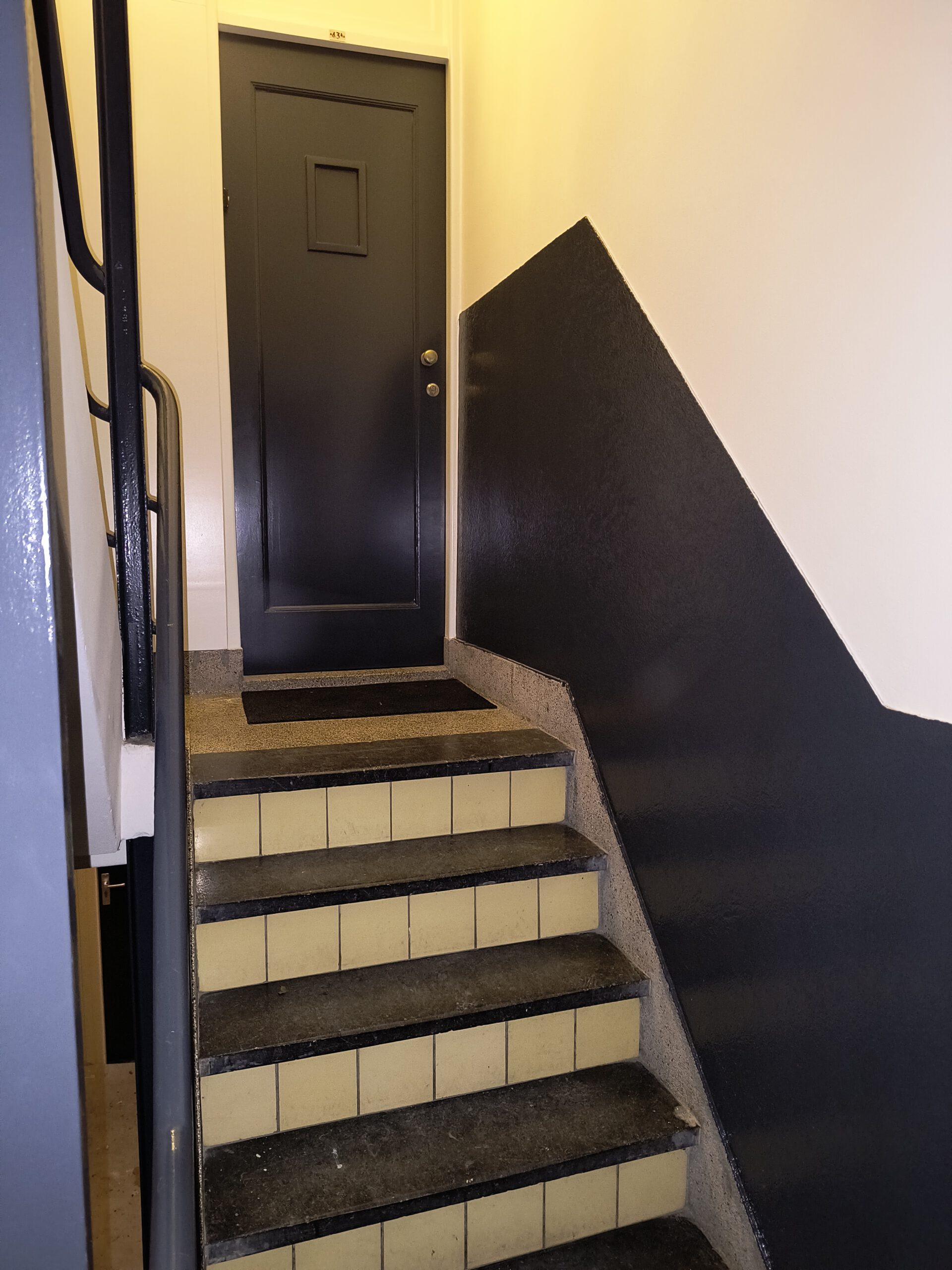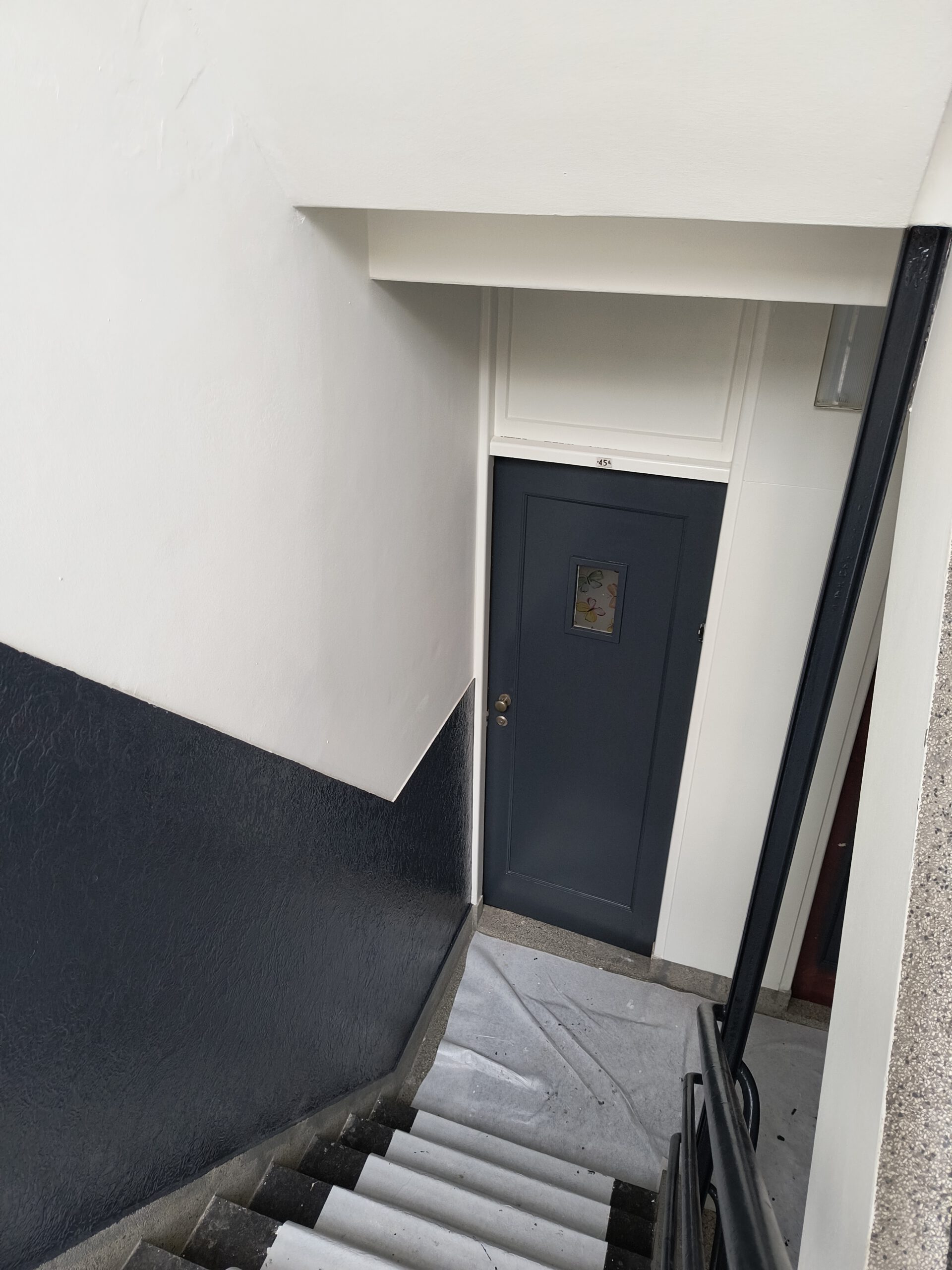 Het opknappen van de portieken , muren weer glad en netjes en daarnaast de oude rode kleur moderniseren geeft nu al weer heel andere aanblik. Er is gekozen voor een mooie antrasiete kleur die je ook buiten om overal ziet terug komen.