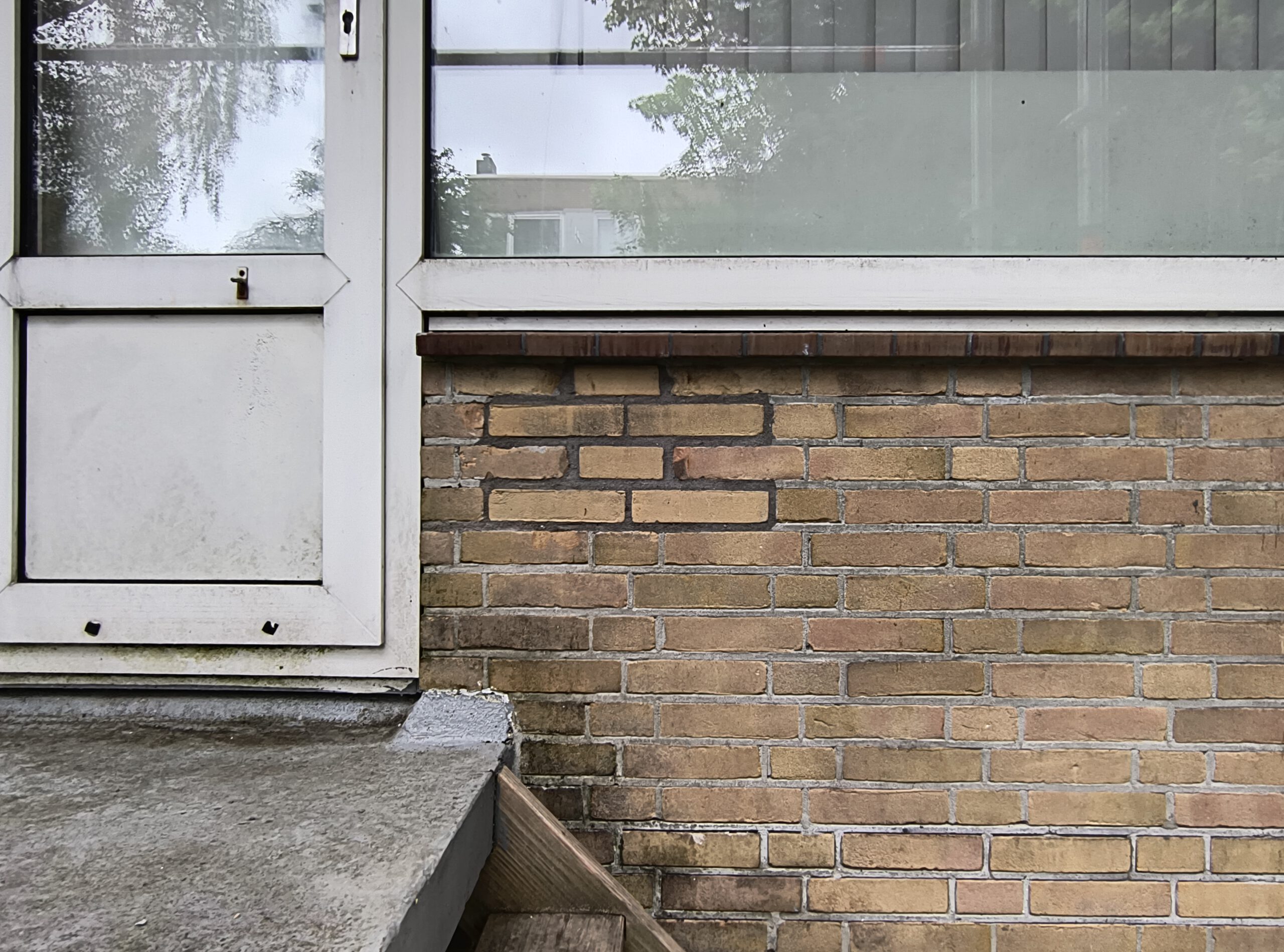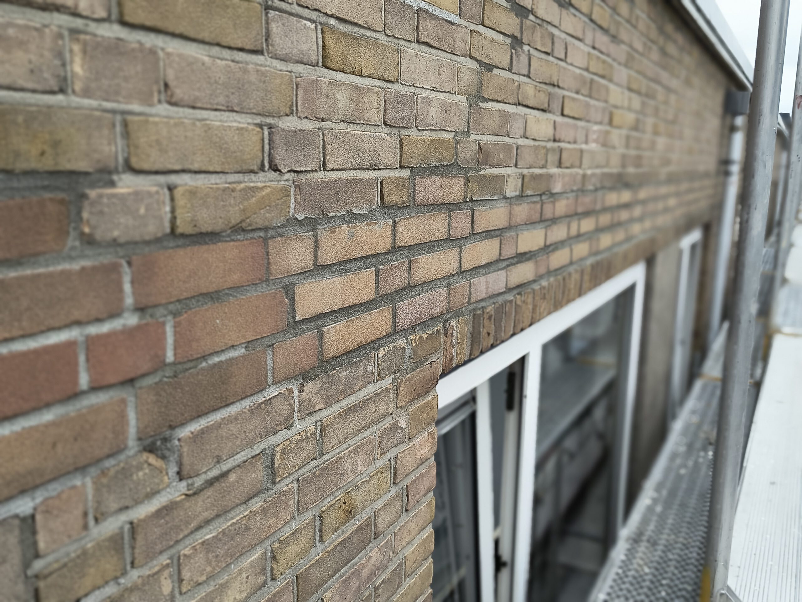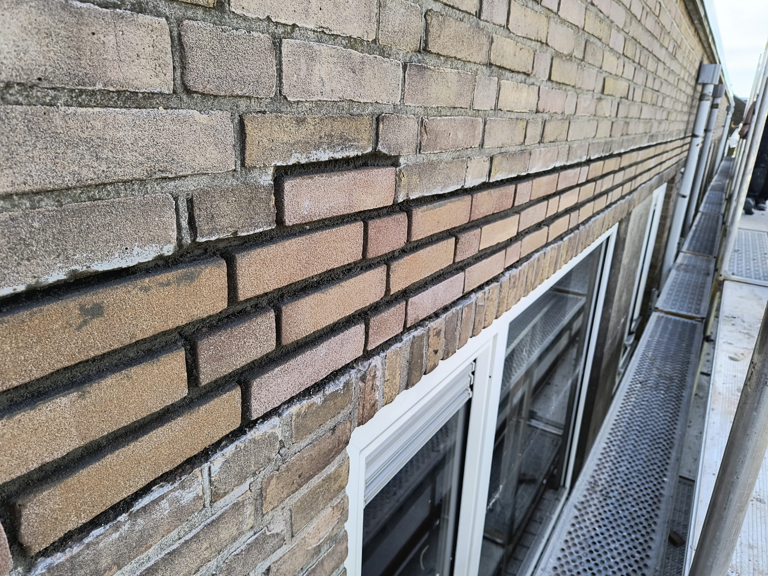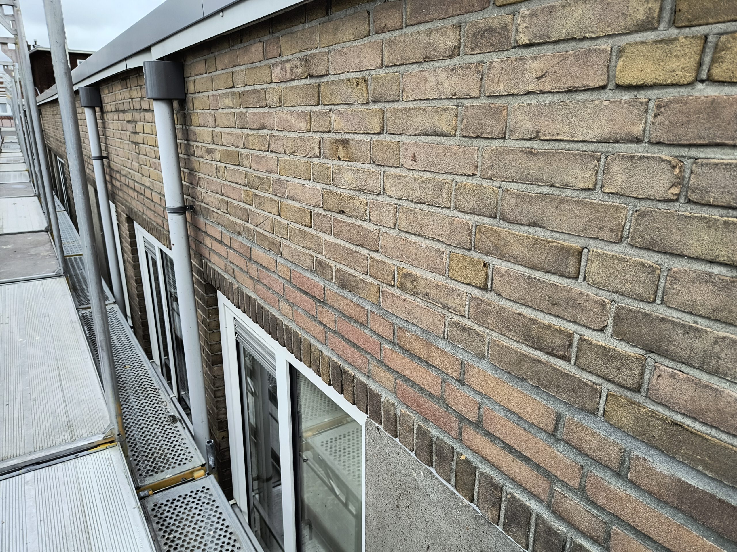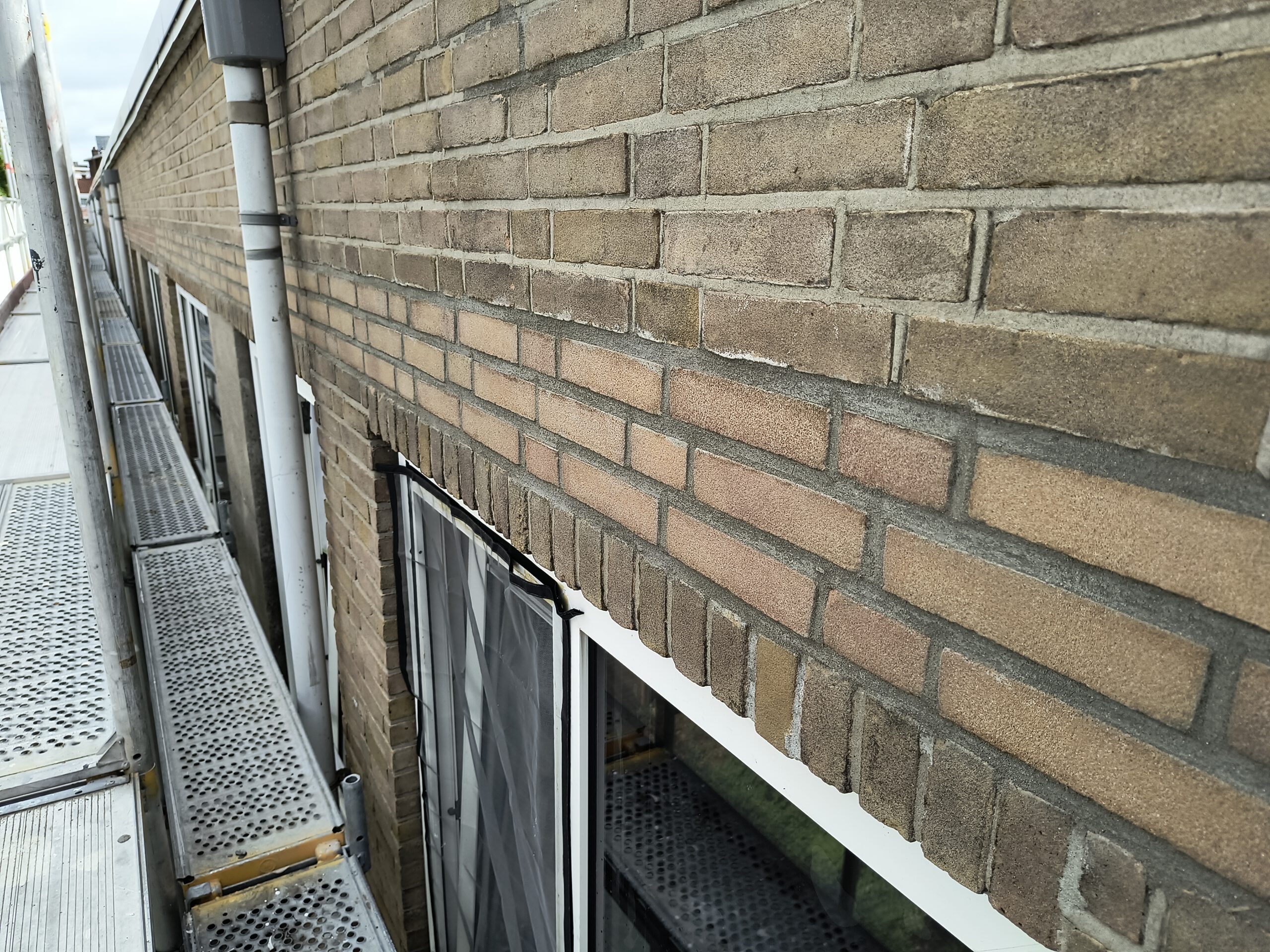 De achtergevel vertoonde scheurvorming slechte voegen , en vocht doorslag naar binnen. De muren zijn opgemetseld zonder spouw maar wel 3 stenen dik.. In de loop van de jaren kreeg je toch vocht wat via de scheuren toetreedt de muur in . Een vochtige muur geeft ook meer koude uitstraling binnen. De gehele muur hersteld en geïmpregneerd zodat de vocht doorslag is opgeheven en de muur er nu weer strak en netjes uitziet. Zie foto's voor & na