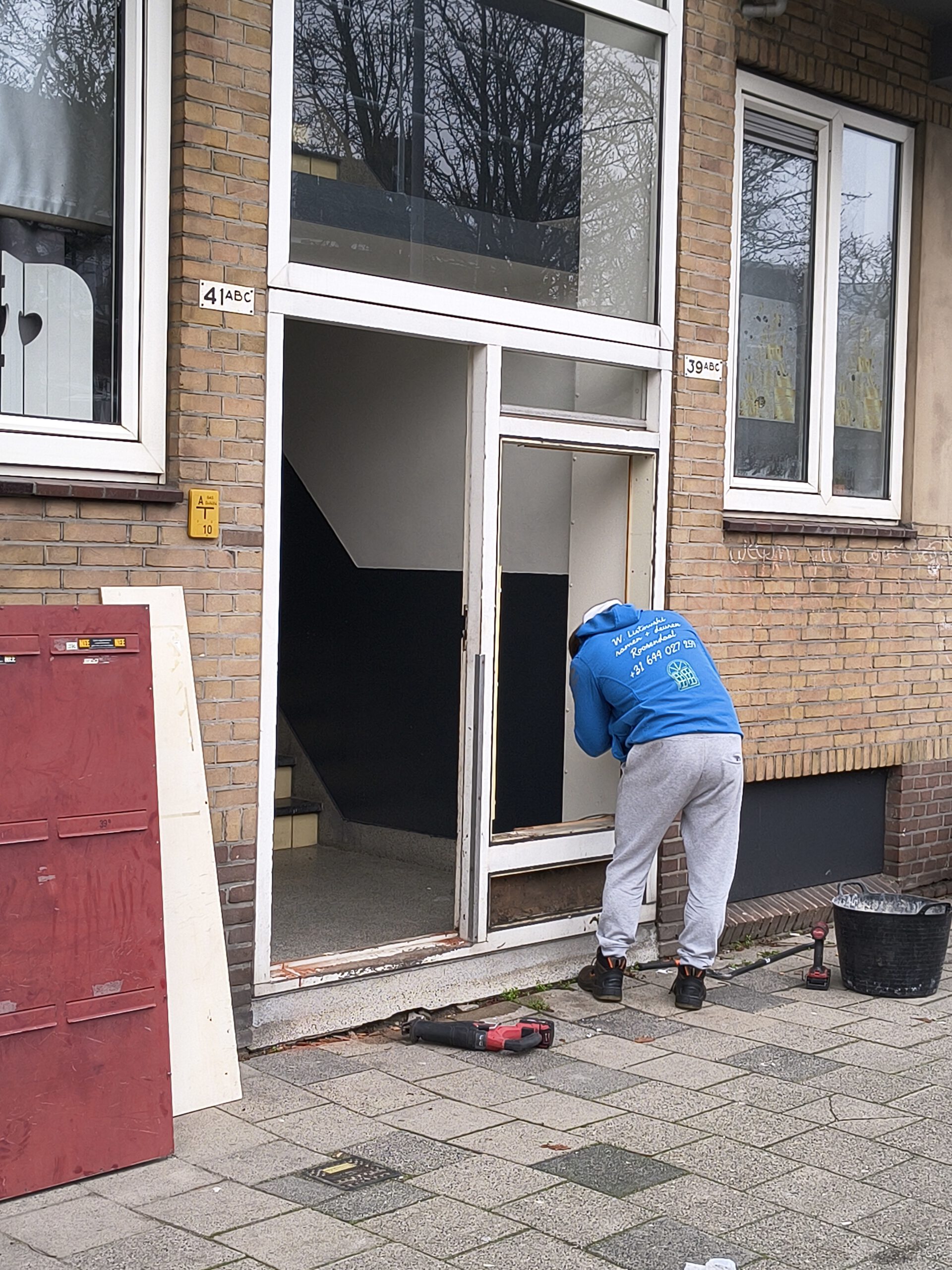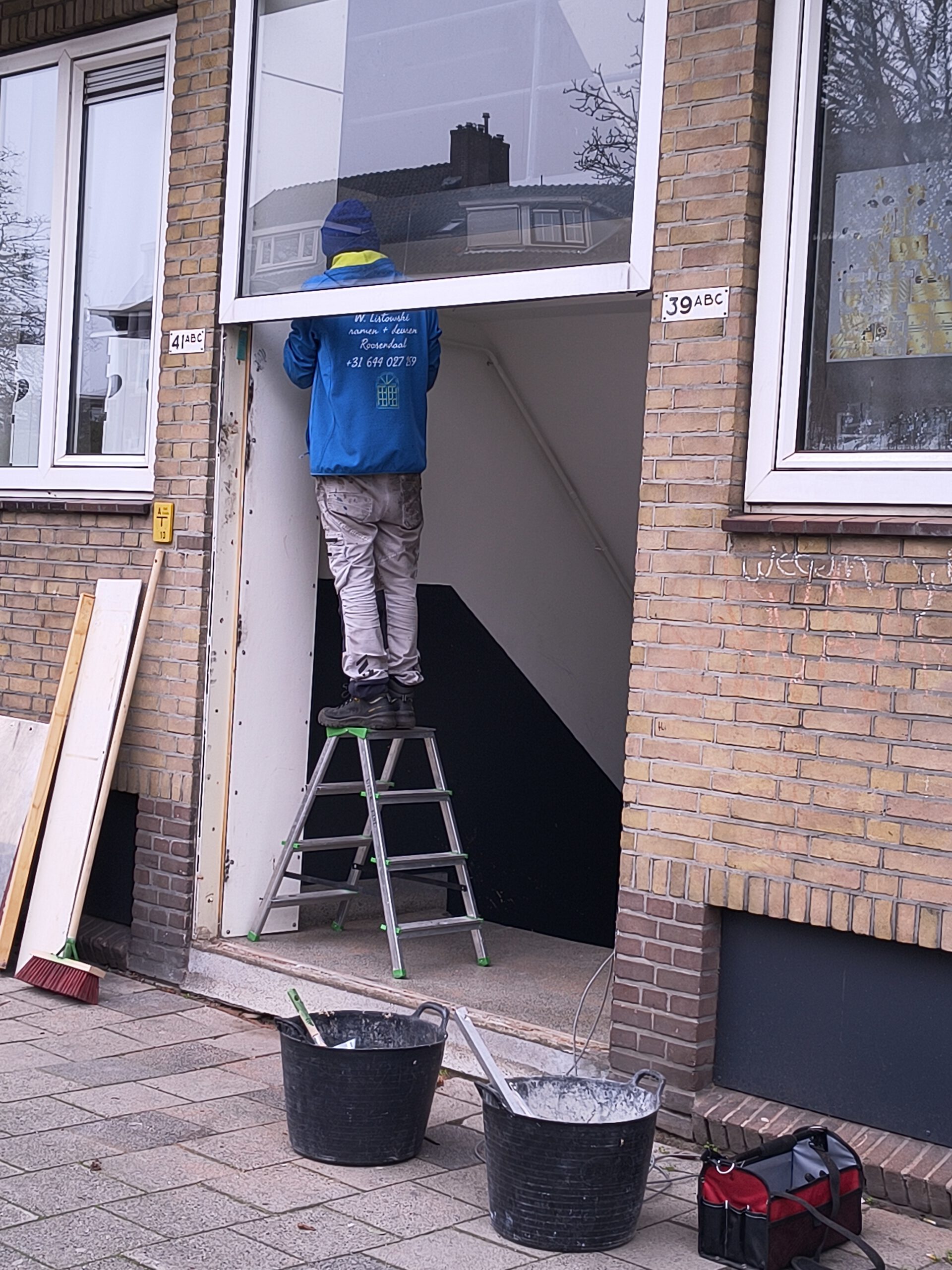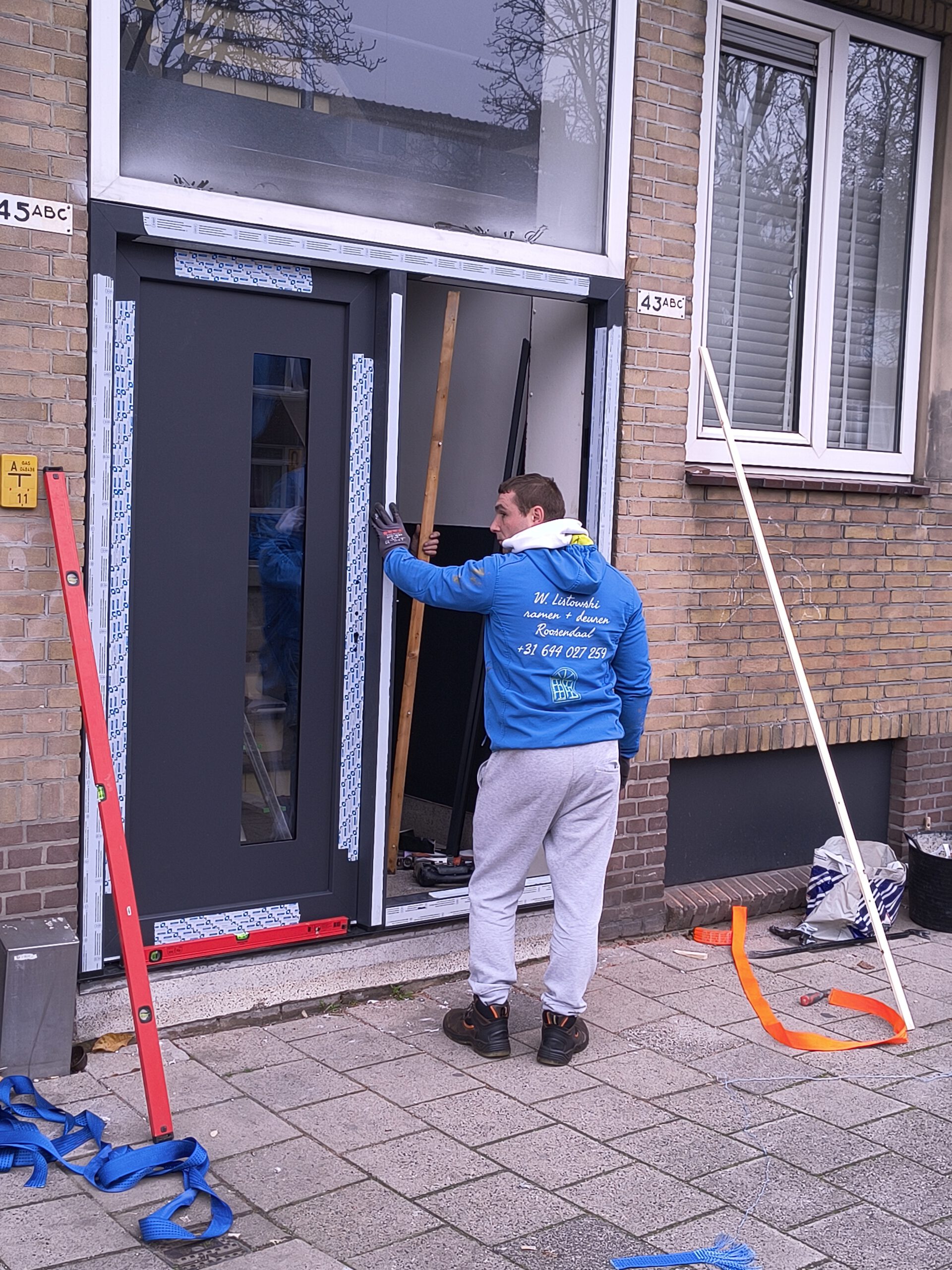 Het gebouw bestaat grotendeels uit kunststof kozijnen. Echter de deuren waren nog van hout. Door de jaren heen was het herstellen van de kozijnen vooral bij de sluitingen steeds ingrijpender om te herstellen. Daar naast waren er meerdere deuren die uit hun lood gingen hangen door ouderdom. Er is dan ook gekozen voor mooie massieve kunststof deuren en zijn tevens de brievenbus partijen en intercoms gemoderniseerd met video intercom. Dit is voor alle 9 vve's uitgevoerd.